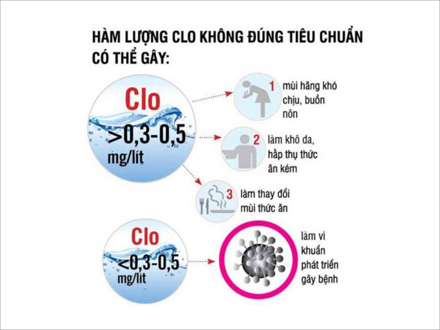 Không có gì để tranh cãi về tác dụng diệt khuẩn của clo trong nước. Nhưng điều đáng lo ngại chính là lượng clo dư tồn tại sau quá trình xử lý có tính chất oxy hóa khá mạnh đã gây ra một loạt các vấn đề nghiêm trọng cho sức khỏe.