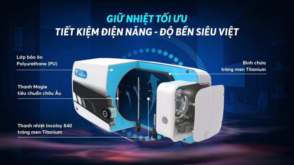 Phần lòng của bình chứa được tráng men Titanium, kết hợp với lớp Polyurethane mật độ cao. Nhờ vậy mà quá trình thất thoát nhiệt bị hạn chế, giúp tiết kiệm điện đun nóng. Bên cạnh đó, bình dùng thanh cọc đốt Incoloy 840 tráng men Titanium, có khả năng chống ăn mòn và bám cặn, cho bình hoạt động hiệu quả, an toàn và tiết kiệm điện trong thời gian dài.
