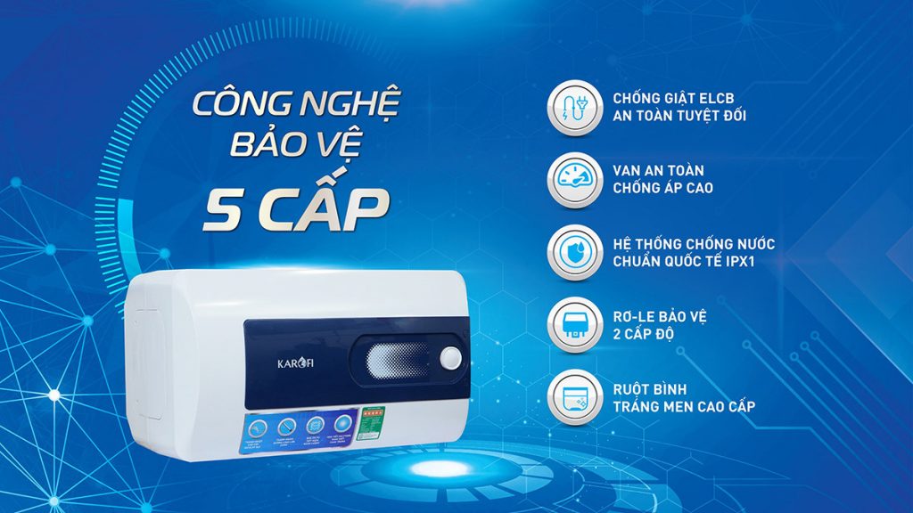 Sử dụng bình nóng lạnh Karofi KBO-R300, những nỗi lo như cháy nổ, rò điện, hư hại… sẽ được gỡ giải. Bởi bình được trang bị tới 5 cấp độ bảo vệ khác nhau. Đảm bảo sự an toàn tối đa cho người dùng, bao gồm: